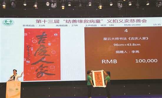 已故佛学家星云大师的墨宝限期竞拍第一轮高潮。由多年捐赠人李亮先生捐赠出的星云大师墨宝《吉庆人家》受到广泛关注。捐赠人介绍,这幅《吉庆人家》是星云大师80多岁,眼睛几乎已经看不见的情况下,以心眼蘸墨疾书、一气呵成的作品,笔触雄浑有力、墨彩飞扬,饱含着对美好生活的向往与祝福,与义拍义卖慈善“结善缘 救病童”的主题不谋而合。拍品以10万元价格拍出,成为本届义拍义卖慈善会第一轮“标王”。