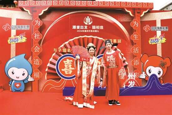“喜相逢”公益福彩打卡墙、“福气投注站”“好彩圈圈乐”……集体婚礼现场设置的福彩宣传打卡和互动专区,吸引了新人合影留念以及市民游客的参与。潮州福彩工作人员向公众宣传福利彩票的公益属性与贡献,传递责任彩票理念,让福彩公益品牌形象更加深入人心。