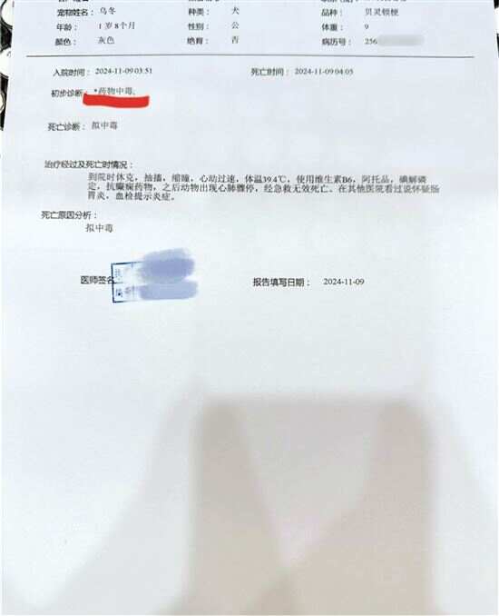 根据李女士提供的诊断书,“乌冬”的死亡诊断和原因分析为拟中毒,治疗经过及死亡时情况说明显示,“乌冬”到院时休克、抽搐、缩瞳、心动过速,体温39.4℃,医生使用了多种药物进行急救,但最终还是未能挽回狗狗的生命。事发后,她向广州市公安局荔湾区分局彩虹派出所报案,目前已立案调查。