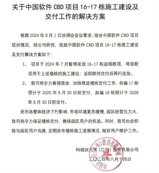 最终,开发商向业主发布了一则通知,表示受整体市场情况影响,园区经营压力大,公司将尽力保证楼栋交付。具体到中国软件CBD项目16-17栋施工建设及交付工作的解决方案,开发商表示,“项目于2024年7月暂停发放16-17栋返租款项,将该款项用于上述楼栋的施工建设,返租款待交付后再行发放。公司将全力筹措资金,加快推进楼栋交付工作,自编17栋预计于2025年9月30日前交付,自编16栋预计于2026年6月30日前交付。”
