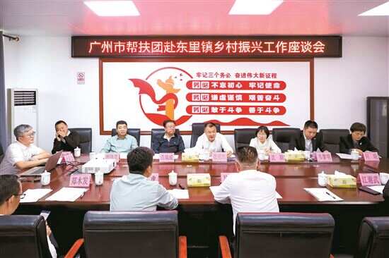 调研组一行首先来到东里镇政府召开乡村振兴座谈会。东里镇党委书记周虎介绍了东里镇基本情况和驻镇帮扶工作。2021年7月,由广州越秀集团股份有限公司牵头,广州市交通运输局、广州市城市管理和综合执法局、广州珠江啤酒股份有限公司联合组团对口帮扶东里镇,通过引入对虾产业培育镇域经济新引擎,聚焦补齐民生设施短板,推进乡村建设,推动东里第二小学建设,助力人才振兴,营造修复生态红树林助力绿美广东建设等,携手推动东里镇“两区两带一湾”发展规划,推进实施乡村振兴战略和“百千万工程”迈向纵深。