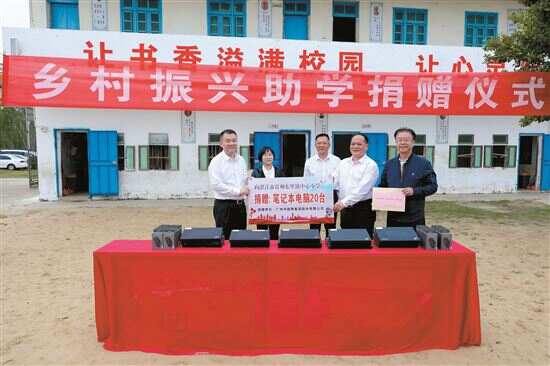 调研组一行还来到西挖小学,参加东里第二小学奠基仪式,并向学校捐赠一批笔记本电脑和“同心筑梦 爱心助学”助学金。