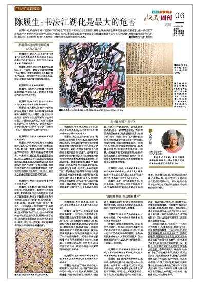 陈履生:是的,他充其量是书写,而不是书法。他之所以也用了书法这个词,可能里面不可避免地有迎合世俗的考虑。但不管如何,我们在评判他的时候,心里要有数。他的“乱书”,只能放在当代艺术的范畴讨论。另外,他依然沿用书法一词,也可能反映出他对书法传统的依依不舍。