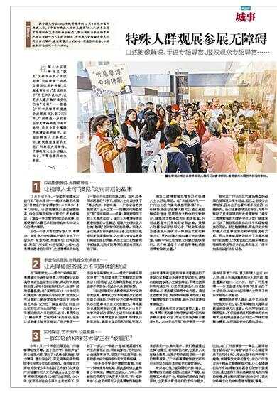 视障人士在博物馆里“摸见”文物与历史;“天使老师”坐在轮椅上为观众提供优质的讲解,实施教育活动;“星星的孩子”用艺术诉说心声,让更多人敞开胸怀接受他们的“特别”……根据《广州市无障碍环境建设发展规划》,至2025年,广州将进一步巩固全国无障碍环境示范市地位,成为全国无障碍环境建设标杆城市。在国际残疾人日到来之际,新快报报道团队走进广州的各大博物馆,了解残障人士如何融入社会,平等地享用文化资源。