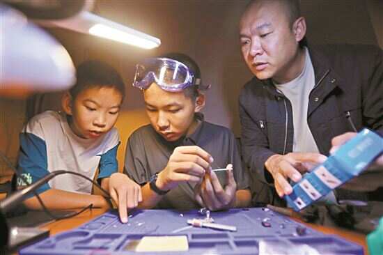 ■曾炜一家人都是无线电迷,爸爸和弟弟凑过来一起制作无线电机。