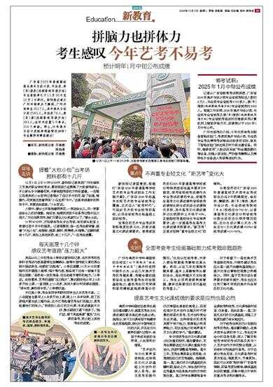 记者从广东省教育考试院获悉,广东省2025年美术与设计类专业省统考报名人数约3万人,书法类专业省统考1700多人,表(导)演类(戏剧影视导演方向)专业省统考约3000人。根据工作安排,2025年美术与设计类、书法类专业省统考及表(导)演类(戏剧影视导演方向)专业省统考笔试科目继续采用计算机网上辅助评卷方式,成绩预计于2025年1月中旬公布。