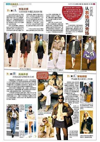 今年更流行的风格是反差感巴恩风,用超大号谷仓外套与轻盈的流苏、碎花或蕾丝等单品营造反差美学,也可在经典复刻的基础上加上一副斯文气质的眼镜,内搭露出衬衫或Polo衫领边或增加一些条纹、格纹元素,营造带有非正式学院气质的“高智感”。