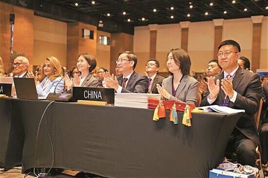 ■12月4日,在巴拉圭亚松森联合国教科文组织保护非物质文化遗产政府间委员会第19届常会评审现场,中国代表团庆祝春节申遗成功。新华社发