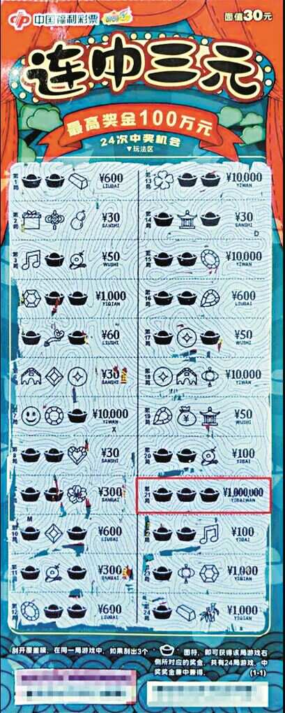 刮刮乐“连中三元”(右图)不单名字吉祥,票面设计也独具匠心,以墨绿色为主题色,红色作为点缀,搭配刮开区象征财富的金元宝图符。顺德区44131247福彩销售站点爆出了该票种100万元最高奖。
