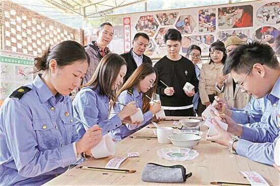 “画花”是石坎传统陶瓷生产中的一道工序,也是团员们现场动手体验的一项制瓷技艺。在专家手把手指导下,大家在各自的陶瓷作品上画出了广铁集团的logo和小火车,互相分享作品和心得,其乐融融。