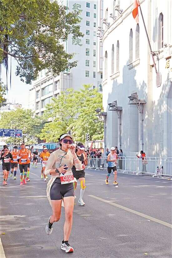 ■一位选手在爱群大厦前一边跑步一边吃东西。