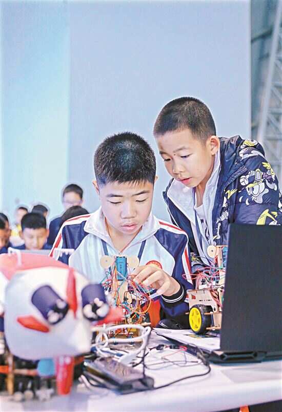 ■两名小选手在组装机器人。 新快报记者 龚吉林/摄