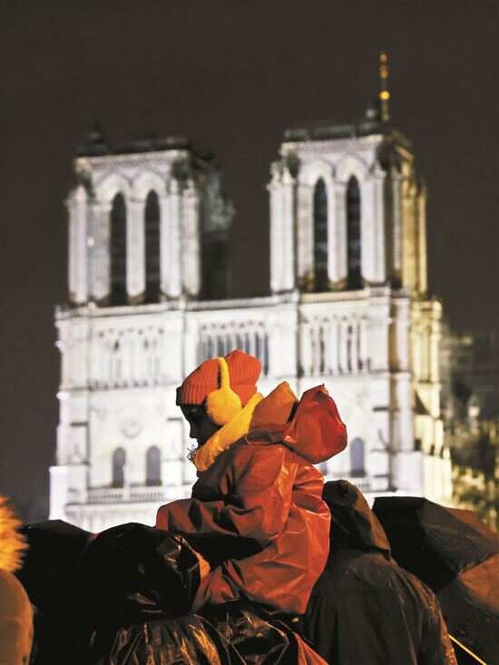 ■12月7日,人们冒雨聚集在法国巴黎圣母院外。新华社发