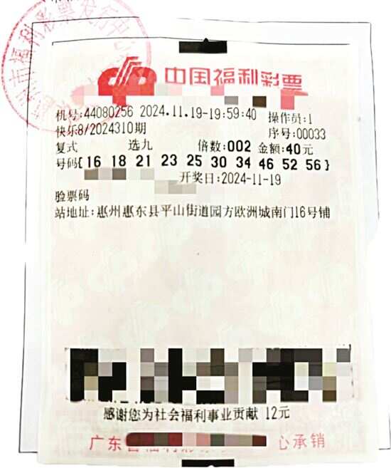 “快乐8”第2024310期全国中出19注“选九中九”,惠州一彩民中了2注