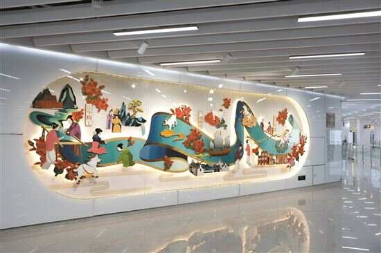 进入十一号线芳村站探营,最吸睛莫过于站厅橱窗。芳村站的非遗主题为“粤绣锦华”,站厅共设有两组文化展示橱窗和一组艺术品展示橱窗,出入口标识也同步植入了非遗元素,使整个车站的设计风格更统一,别具一番岭南韵味。芳村站的站厅橱窗重点展示了中国四大名绣之一的广绣和具有岭南传统文化特色的广雕。