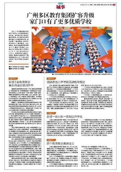 近日,广州市教育集团布局迎来了新变化,多区教育集团扩容升级。新快报记者从海珠区教育局获悉,为打造更加优质均衡的基本公共教育服务体系,该区新增2个教育集团,并同步扩容原有的4个教育集团。此次调整后,海珠区基础教育集团增至11个,覆盖74所学校,占比接近80%,提供优质中小学学位8.8万个、幼儿园优质学位2740个。除海珠区外,越秀区、花都区、增城区也相继发布了教育集团新动态,为广大家长和学生提供了更加丰富多元的教育选择。