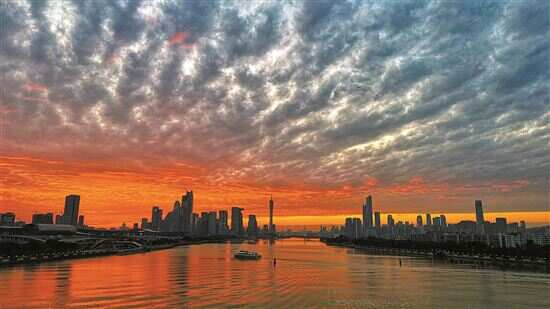12月17日,随着太阳西下,羊城上空出现漫天火烧云,在夕阳、云层衬托下,珠江边的广州塔蔚为壮观。 新快报记者 夏世焱/摄影报道