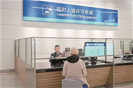 ■白云边检站的移民管理警察在为旅客办理240小时临时入境许可。通讯员供图
