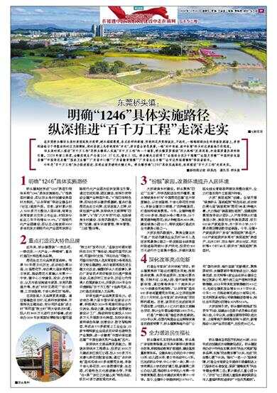 桥头镇制定形成“1239”典型引领体系和“1246”具体实施路径。“1”指典型村建设,即以田头角村创建省典型村为契机,“以点带面”带动全镇各村(社区)提质升级。目前,该村累计投入5000多万元整治人居环境,培育出东莞首家北交所上市企业,村股东分红近三年平均增长15.4%。“2”指现代化产业园建设,即以总占地面积4500多亩的东太湖现代化产业园和东深公路现代化产业园为经济发展主引擎,通过空间拓展、园区建设、招商引资带动全镇产业转型升级。“4”指四张特色牌,即结合桥头镇资源禀赋,重点打造荷花生态文化牌、名贤故里人文牌、环保包装产业牌、东深供水文旅牌等“四张牌”。“6”指“六大专项”行动,包括绿美乡村建设、农房风貌提升、“美丽庭院”创建、城乡环境管理、停车管理、“三线”整治等。
