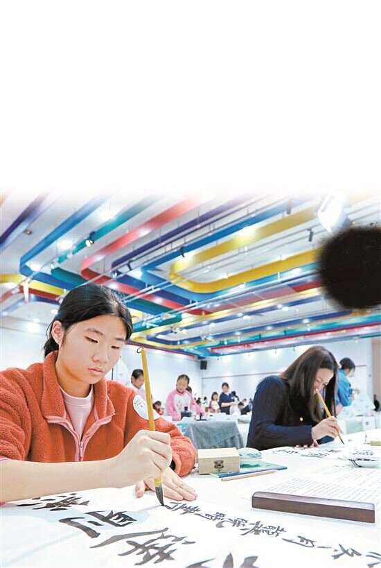 ■12月22日,第八届“翰墨青春 传承岭南”广东青少年书画大赛佛山分赛区书法现场赛在佛山市青少年文化宫(市一宫)开赛,400多名青少年同场挥毫竞技。新快报记者 龚吉林 观显锋/摄