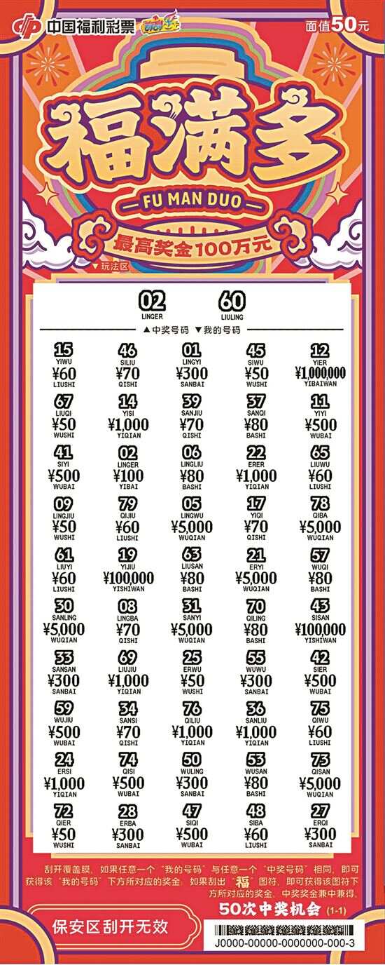 玩法:刮开覆盖膜,如果任意一个“我的号码”与任意一个“中奖号码”相同,即可获得该“我的号码”下方所对应的奖金;如果刮出“福”图符,即可获得该图符下方所对应的奖金。中奖奖金兼中兼得。
