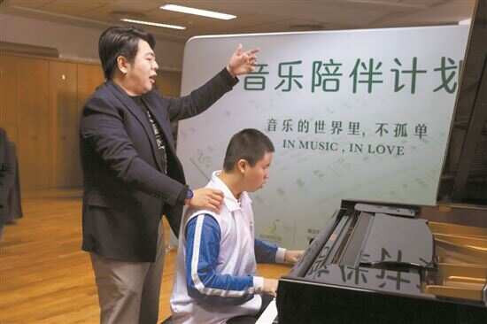 ■郎朗支持“音乐陪伴计划”,在星海音乐厅现场指导视障学生刘伯欢演奏《彩云追月》。