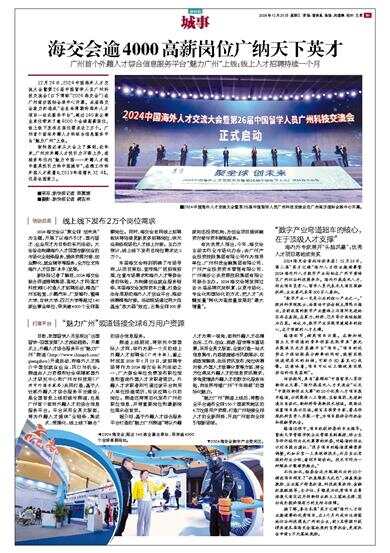 12月24日,2024中国海外人才交流大会暨第26届中国留学人员广州科技交流会(以下简称“2024海交会”)在广州南沙国际会展中心开幕。本届海交会致力打造成“全生命周期的海外人才项目一站式服务平台”,超过140家企事业单位带来了逾4000个全球高薪岗位,线上线下发布总岗位需求达2万个。广州首个面向外籍人才的综合信息服务平台“魅力广州”上线。