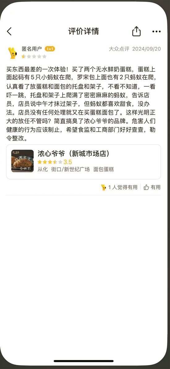实际上,浓心爷爷门店曾多次因食品安全问题遭到曝光。2022年,浓心爷爷广州一门店曾因员工使用环卫车装半成品面包而引发舆情,浓心爷爷总公司相关负责人承认,员工使用保洁车装载面包确实不妥,并对涉事员工进行处罚,相关批次的面包被销毁。今年11月,有网友晒图称在浓心爷爷的产品中发现苍蝇。今年5月,有员工曝出广州一浓心爷爷门店拖欠工资,同时晒出了蛋糕上有蚊虫的图。