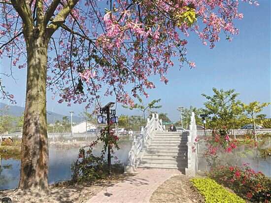 演唱会在坛头村异木棉景区进行。近日,盐鸿镇坛头村灵慧瑶池旁的异木棉景观受到广泛关注。两棵近10米高的粉色异木棉在冬日暖阳的照耀下双双盛放,一片花影粉海尽收眼底,吸引了众多市民和游客前往观赏“打卡”。据了解,异木棉是常见绿化观赏树,预计花期可持续到明年1月份。驻盐鸿镇工作队与坛头村委积极协作,通过为异木棉景区配套服务设施、积极组织群众性文体活动,将坛头村景观长廊、灵慧瑶池、鸣凤广场等多处景观节点串珠成链,打造当地又一农文旅相结合的典范项目。