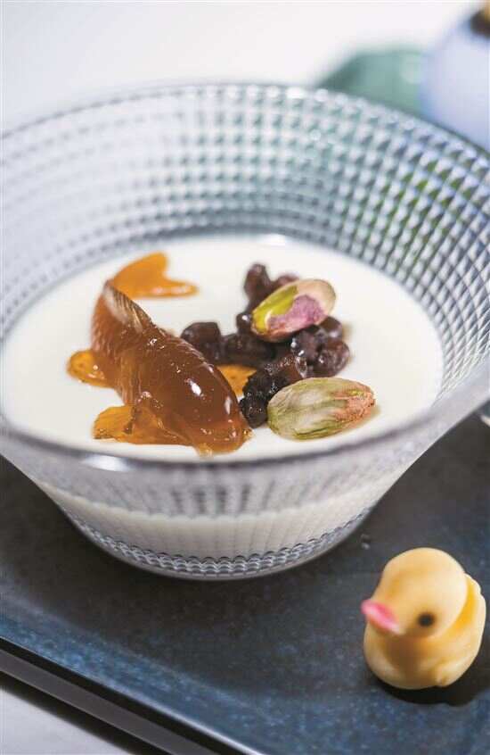 ■双皮奶的摆盘精致中透着心思,马蹄做的“锦鲤”栩栩如生,一角那可爱的小鸭也是可以吃哒。