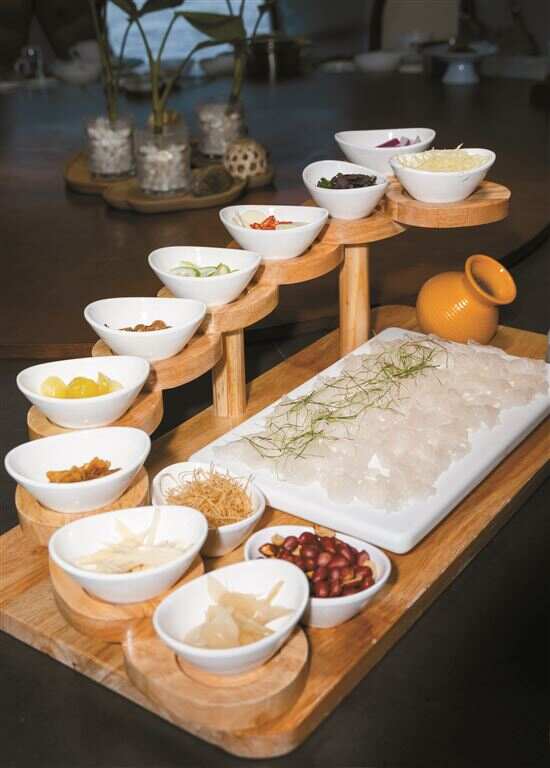 鱼生的吃法偏顺德,但又不完全“顺德”,也很“自成一派”的感觉。木质的容器应该是专门定制的,吃鱼生的配料用元宝形的小碗盛着,次第向上排列,正应了“步步高升”的好意头。晶莹剔透、薄如蝉翼般的鱼肉,在柠檬叶丝、姜丝、蒜片、葱白丝、紫苏叶丝等十几种配料和喷香的花生油以及喜马拉雅岩盐的烘托下,更将鱼肉自身的鲜与甜激发得恰到好处。