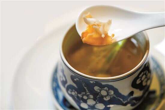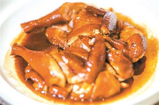 粤菜中相对比较家常的玫瑰豉油鸡,在保哥手中“摇身一变”成了招牌菜七号茶皇鸡,选净重两斤半左右的海南文昌鸡,将其“许配”给了广西横县的茉莉花,从色泽到滋味都令人“下箸如有神”。