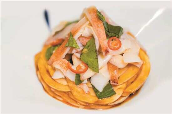 类似的“自制”还有很多,保哥称自己的从厨经历是“边学边成长”,入行多年,除了粤菜的基础,西餐、东南亚菜的烹饪手法也都先后接触过、学习过,久而久之形成了如今非常鲜明的个人风格——味型的处理手法大胆泼辣,摆盘则借鉴西餐的精致,菜品既不跳脱粤菜风味,又若隐若现几丝东南亚料理的腔调,这种冲击力无疑让食客的味蕾得到强烈满足,所谓“有滋有味”几个字,在此处得到了真真正正的诠释。