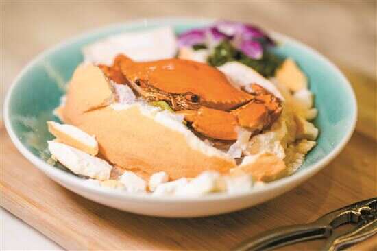 最有仪式感的一道菜是那道名为“谢谢你”的盐焗奄仔蟹,盐焗的做法,美妙之处在于奄仔蟹的肚皮下面垫了一片柠檬叶,当你敲敲打打将外壳的盐敲碎再拆出包裹在纸里的奄仔蟹时,第一时间扑鼻而来的是柠檬叶的那股清香,令人油然生出一种无以名状的惊喜,再联想到“谢谢你”的菜名,既可以是螃蟹的“蟹”,又取感谢的“谢”,双重美好多种寓意送上新年祝福,美食之余温情暖意加分。