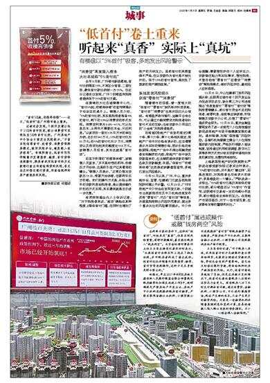 记者走访发现,个别开发商以低于15%的首付吸客,称以消费贷可实现低至5%的首付比例。广州房地产中介协会日前发出风险提示,“不盲目轻信零首付、经营贷、消费贷等购房模式,做好风险评估,避免陷入经济困局”。有律师指出,低首付往往伴随着开发商垫资、融资、首付贷等违规操作,购房者采用低首付的方式被银行查出将面临停贷的风险,若无法及时偿还银行贷款,将面临抵押的房产被拍卖的风险。