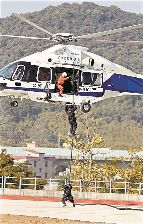 ▲特警队员从直升机上快速落地。