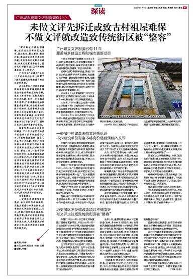 据新快报记者长达数年的调查,广州历史城区内的多个改造项目没有依法进行文评,导致传统建筑被“整容”,失去了历史风貌;两处广州首批做地试点的城中村改造项目没有依法完成文评就开展征收、拆迁工作,一些有保护价值的清代、民国建筑险些被列入拆除之列;不少城中村改造项目的改造主体要求文评编制单位不将有保护价值的建筑纳入保护对象之列以便拆除;位于历史城区的项目文评报告绝大部分没有依规定进行专家论证、公示,甚至与公众关注的广州火车站改造相关的《广州站站城产居一体化地区控规优化》也没有依规定对文评专章进行专家论证、公示,受到专家与市民批评。