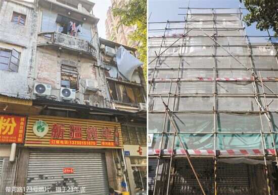 ■传统风貌建筑线索带河路173号和生堂旧址(左图:原貌,2023年年底摄,广州市城市更新规划研究院供图;右图:立面被涂料覆盖后,2024年11月7日摄)