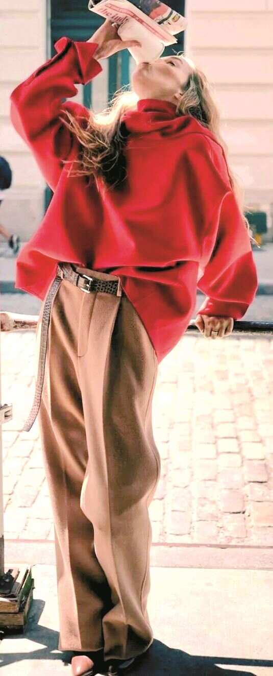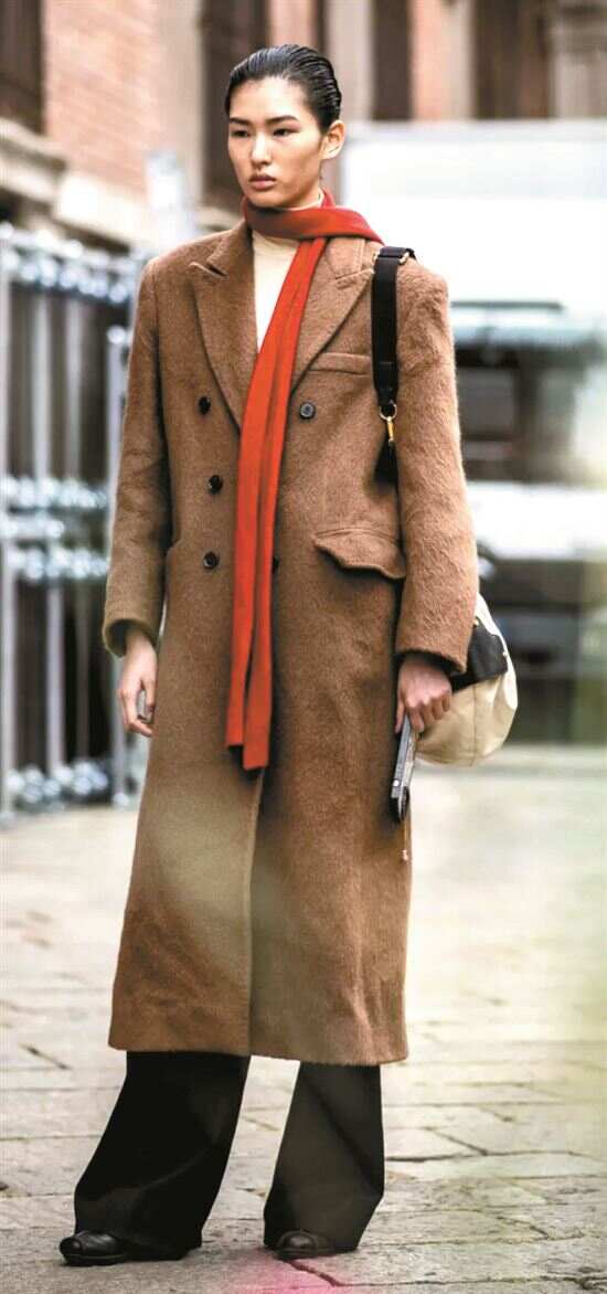 ■用红色作为一点点缀,便能点亮整套棕色系穿搭。