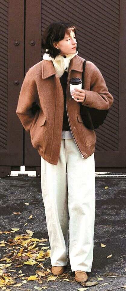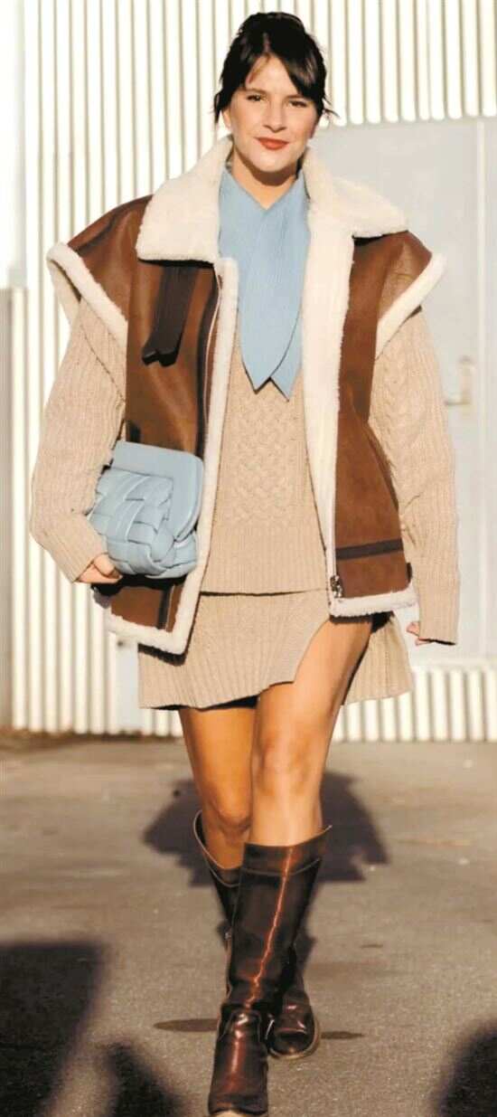 ■时髦穿法之一是在棕色系外套里露出蓝色领口,更有层次感。
