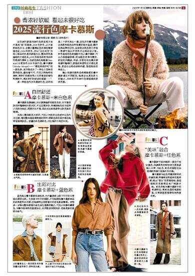 近年流行穿搭与流行色彩呈现万变不离其“棕”的趋势,2023年秋冬,以大面积棕色为主、点缀少量橘红色的美拉德穿搭走红;2024年秋冬,则以“谷仓夹克”为核心单品的巴恩风穿搭为主,整体同样是偏棕的大地色系;2025年棕色依然写在秋冬季流行榜单上,权威色彩机构潘通(Pantone)日前发布2025年流行色:摩卡慕斯(Mocha Mousse)——“看起来很好吃”的一款色彩,官方描述为:“一种令人回味的柔和棕色,蕴含着可可、巧克力和咖啡的美味,将我们的感官带入它所激发的愉悦和美味中,满足我们对舒适的渴望……”