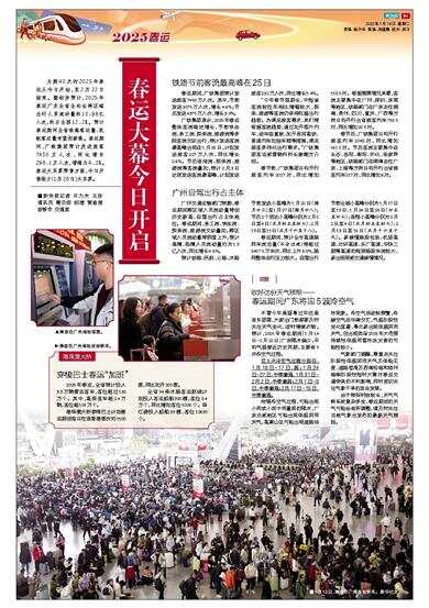 为期40天的2025年春运从今日开始,至2月22日结束。据初步预计,2025年春运广东全省全社会跨区域出行人员流动量约10.98亿人次,约占全国12.2%。预计春运期间全省铁路客运量、民航客运量有望创新高。春运期间,广铁集团预计发送旅客7450万人次,同比增长298.1万人次,增幅为4.2%。春运火车票预售方面,今日开售除夕(1月28日)火车票。