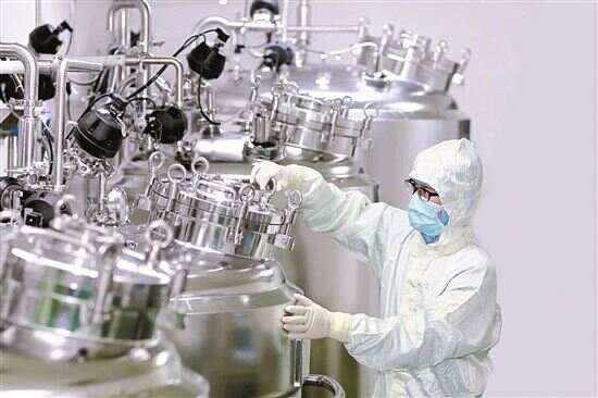 ■工作人员在生物制剂生产车间配液。(资料图)新华社发