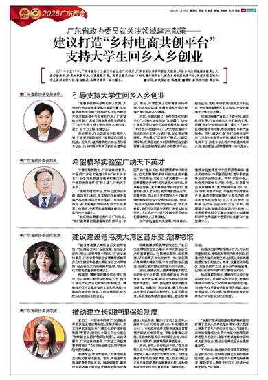 1月14日至17日,广东省政协十三届三次会议在广州召开,广东省政协委员积极递交提案,并结合关注领域建言献策。大家纷纷表示,将更加积极有为,认真履职尽责。有委员建议打造“乡村电商共创平台”,建设乡村专属电商平台,为返乡创业的大学生提供电商入驻、物流配送、品牌营销等一体化服务。