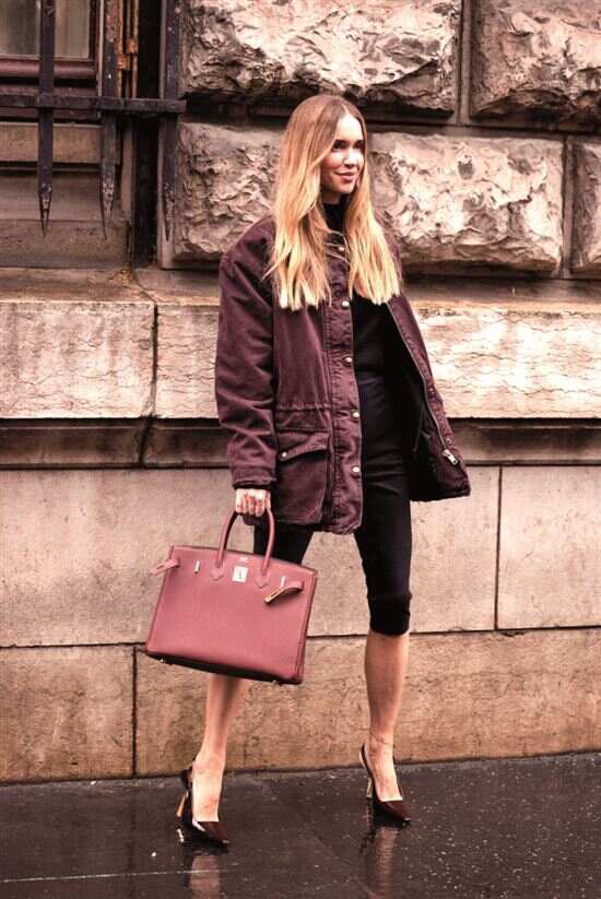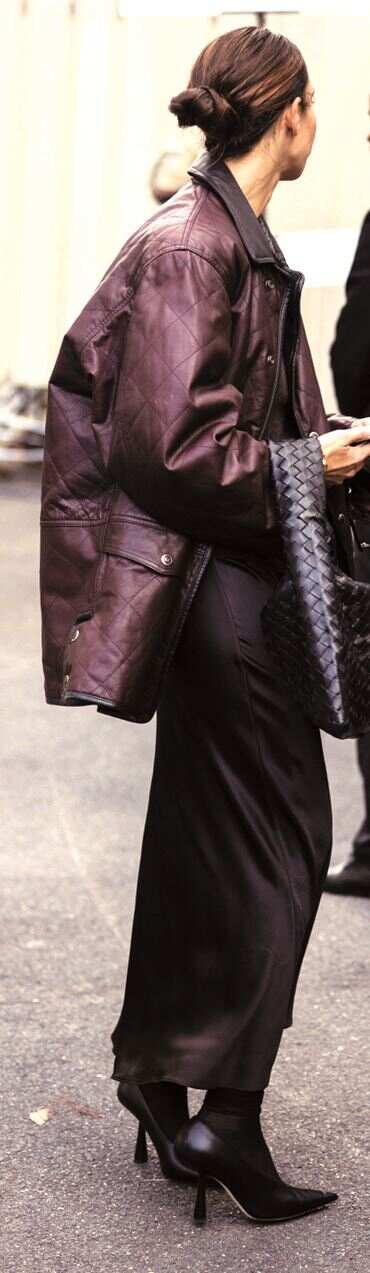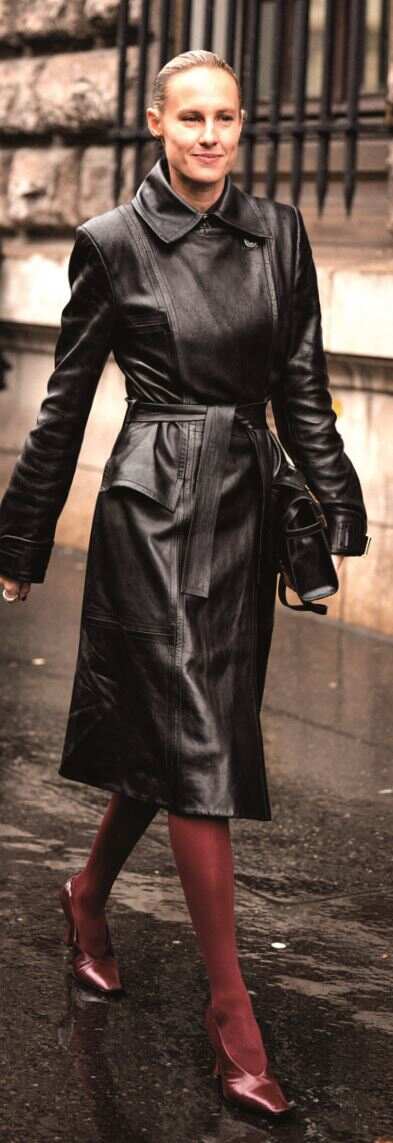 面料选择以质感优先,首选有光泽、挺括的料子如皮质或缎面单品;此外巧用其余色彩对整体造型的色彩进行调和,彰显穿搭风格与个性。例如搭灰色,两者都沉稳大气,色彩占比可随意调整;搭蓝色,则会令人感受到清爽大气的气质,英伦复古风和知识分子风轻松拿捏;搭白色,清新明亮的视觉效果为整体造型注入活力;搭黄色,明艳醒目,为穿搭增添奢华。