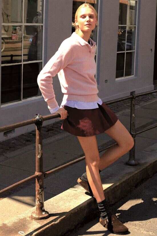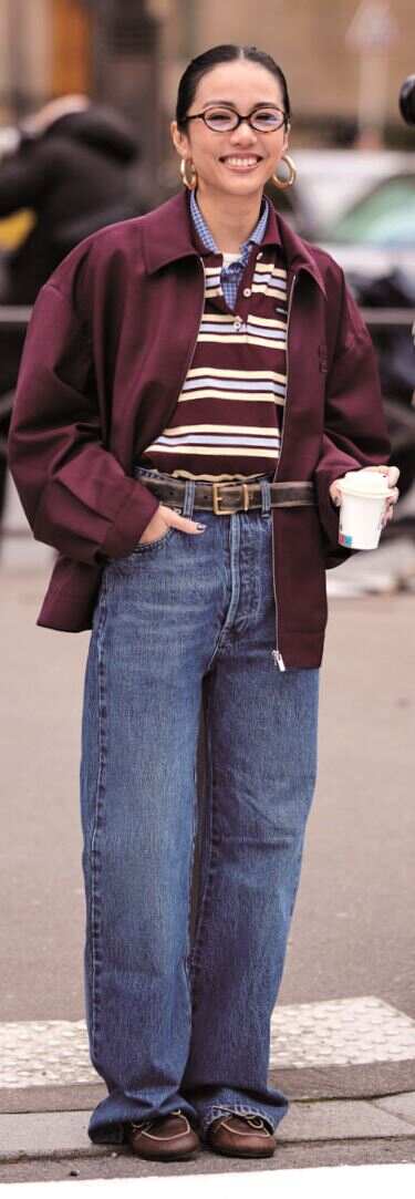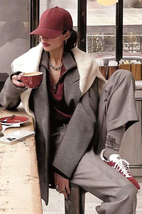 ■搭些相反风格的单品,会让安可拉红的整体造型穿搭更显年轻时髦。