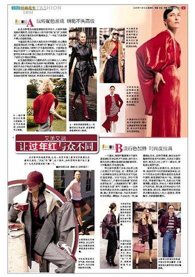 符合新年氛围又没有正红那么挑人的莫过于安可拉红,这一季秀场上多个品牌都有呈现全身同色系安可拉红的造型穿搭。对安可拉红,评价可谓“两极分化”,不喜欢的戏称像“老奶奶在穿的红色”,上身就超级加“辈”;喜欢的则视其为显“贵气”的颜色——这种低饱和度红在色相上偏深红或牛血色调,融入更多沉稳内敛,与近年来流行的勃艮第红、樱桃红、牛血红色一样,偏属酒红色系,自带风情感,确实会给时髦精带来显老气的困扰,但其实只要在面料、配色及占比上多下一番功夫,便能穿出高贵气质。