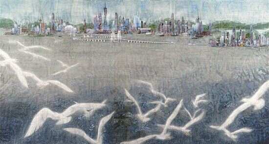 广州画院专职画家、创研部主任陈川介绍,《春到岭南——大湾区建设》画面近景为逐浪飞翔的海鸥群,略微虚化,远景是大湾区11个都市的风景线,以港珠澳大桥连接。画面通过简约的动线和点线面等形式语言来追求优美抒情、浪漫时尚的情调。