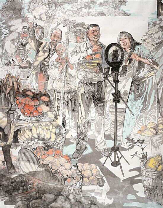 广州美术学院外聘教师王鹏程也介绍,《直播助农—我们为自己代言》作品以短视频App中的一系列“县长直播间”现象为表现对象。整幅画为方形构图,人物有基层干部、主持人和农民,周围的道具为天然的农产品及其加工品。将人物放置于自然场景下,突出自然中的蓝天、白云以及人物的形象与动态,试图营造出一种健康、喜悦、人与自然和谐共处的氛围。(梁志钦)