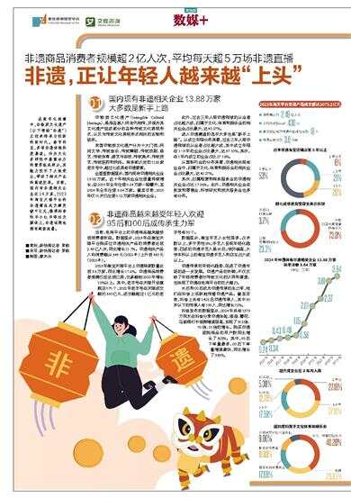 在数字化浪潮中,非物质文化遗产(以下简称“非遗”)正迎来传承与创新的新时代。春节将至,多项非遗体验热度暴涨。作为文化多样性中最富活力的重要组成部分,其魅力吸引了大批受众,带动了相关产业的高速发展。目前,国内有非遗相关企业近14万家,2023年淘宝天猫平台的非遗商品成交额突破千亿元,微博抖音快手小红书等社交媒体上,非遗话题也拥有超级流量。